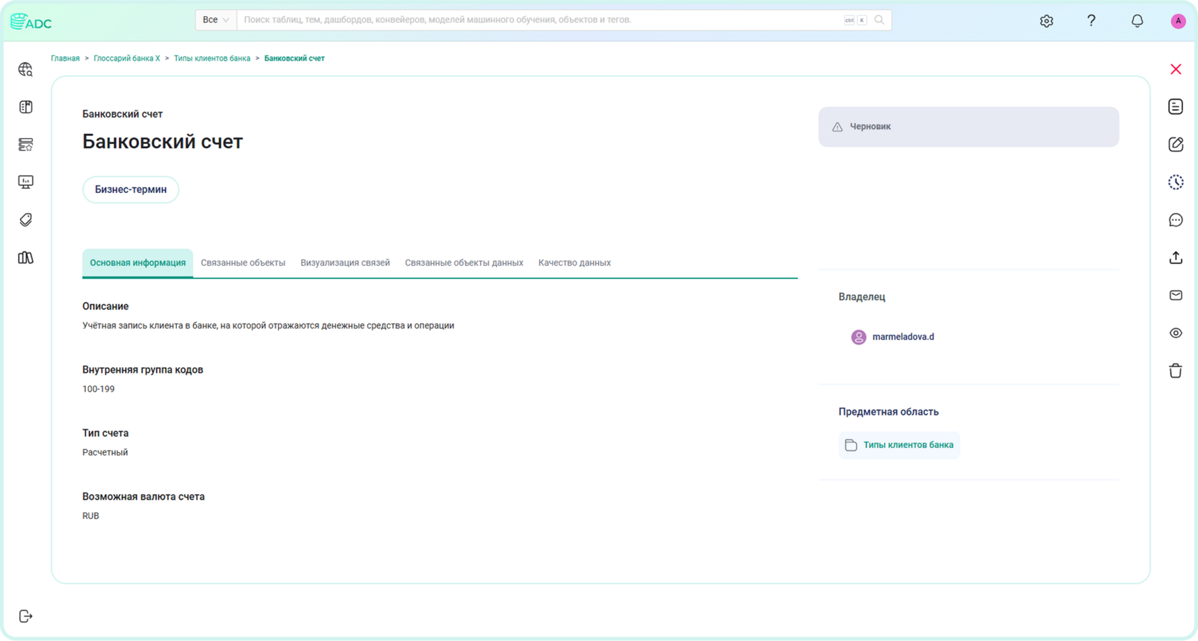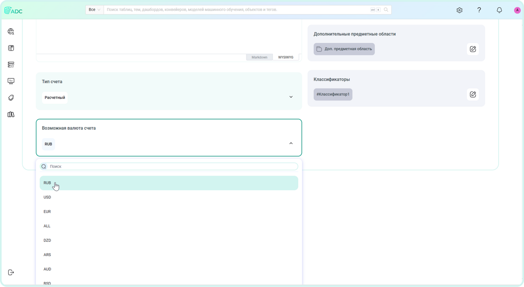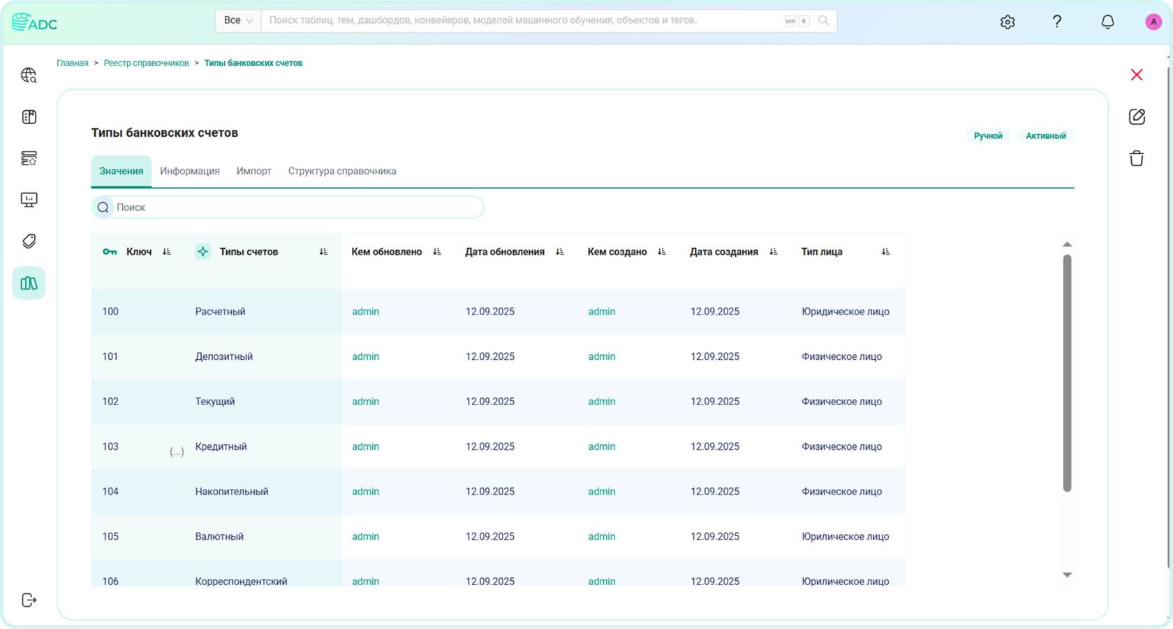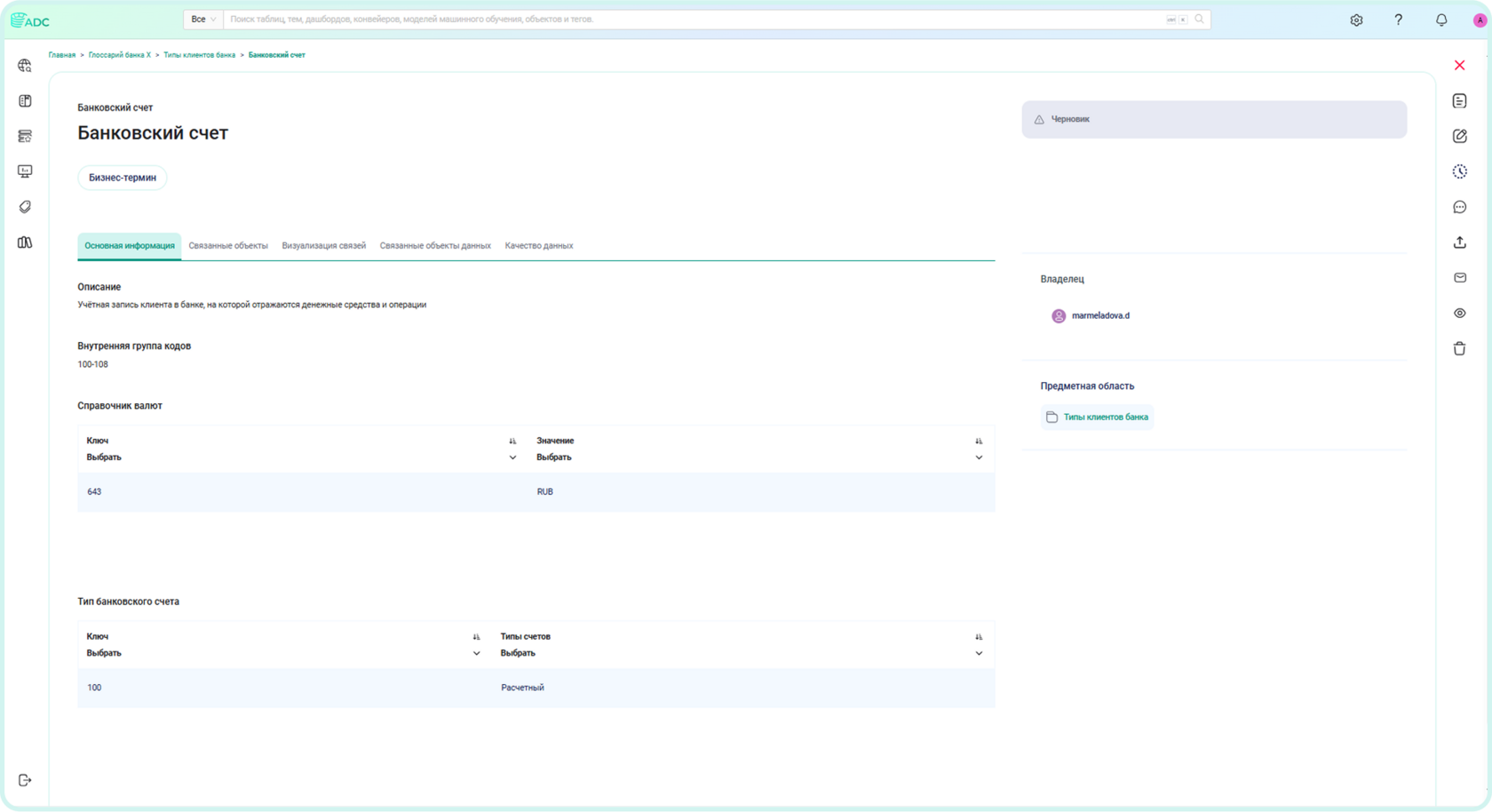 Рассмотрим пример, когда та же самая информация по типам счетов и валюты ведётся в Arenadata Catalog в виде справочных значений.