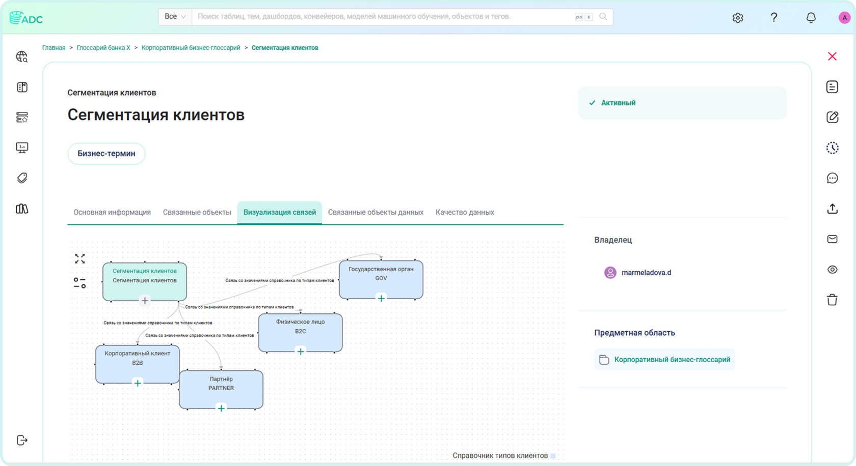 Объекты глоссария связаны с соответствующими по кодировке значениями вспомогательного справочника. В карточке объекта глоссария «Сегментация клиентов» данная связь представлена в виде пары «Ключ — Основное значение» справочника. При необходимости структуру справочника доступно корректировать — так, основным значением, вынесенным в карточку объекта глоссария, может стать иной пользовательский атрибут в соответствии с форматно-логическим контролем.
