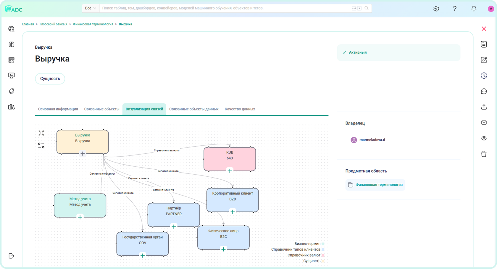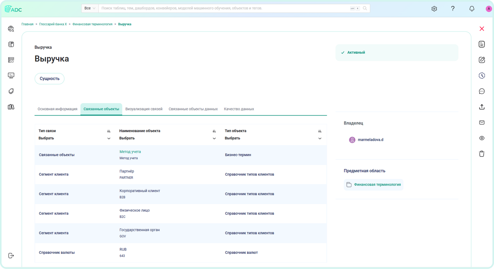 В глоссарии ведётся предметная область «Финансовая терминология». Для примера создан объект глоссария «Выручка». Объект глоссария связан со значениями вспомогательных справочников «Справочник валюты» и «Справочник типов клиентов», а также бизнес-терминами.
