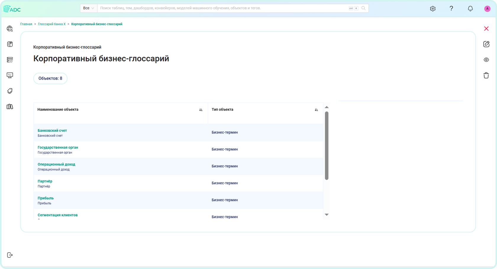 Arenadata Catalog предлагает развитый функционал бизнес-глоссария, который поддерживает ведение иерархичных объектов и кастомизации карточки объектов с расширением атрибутивного состава.