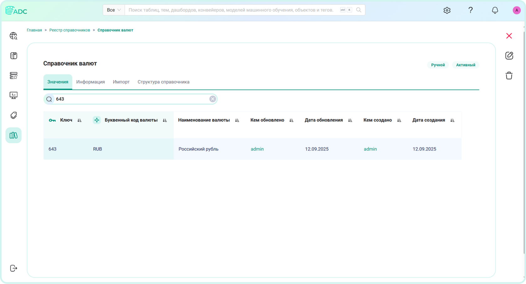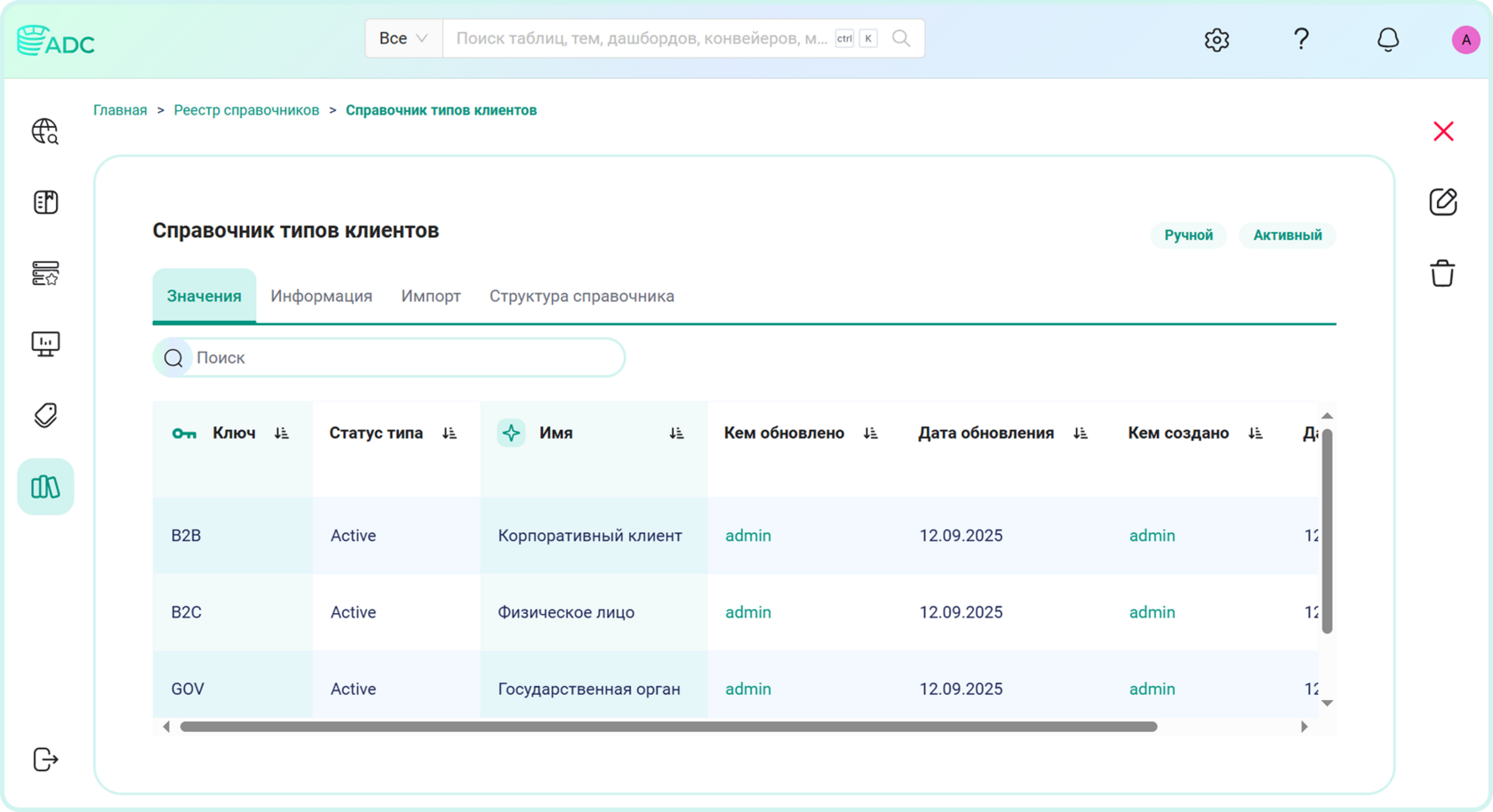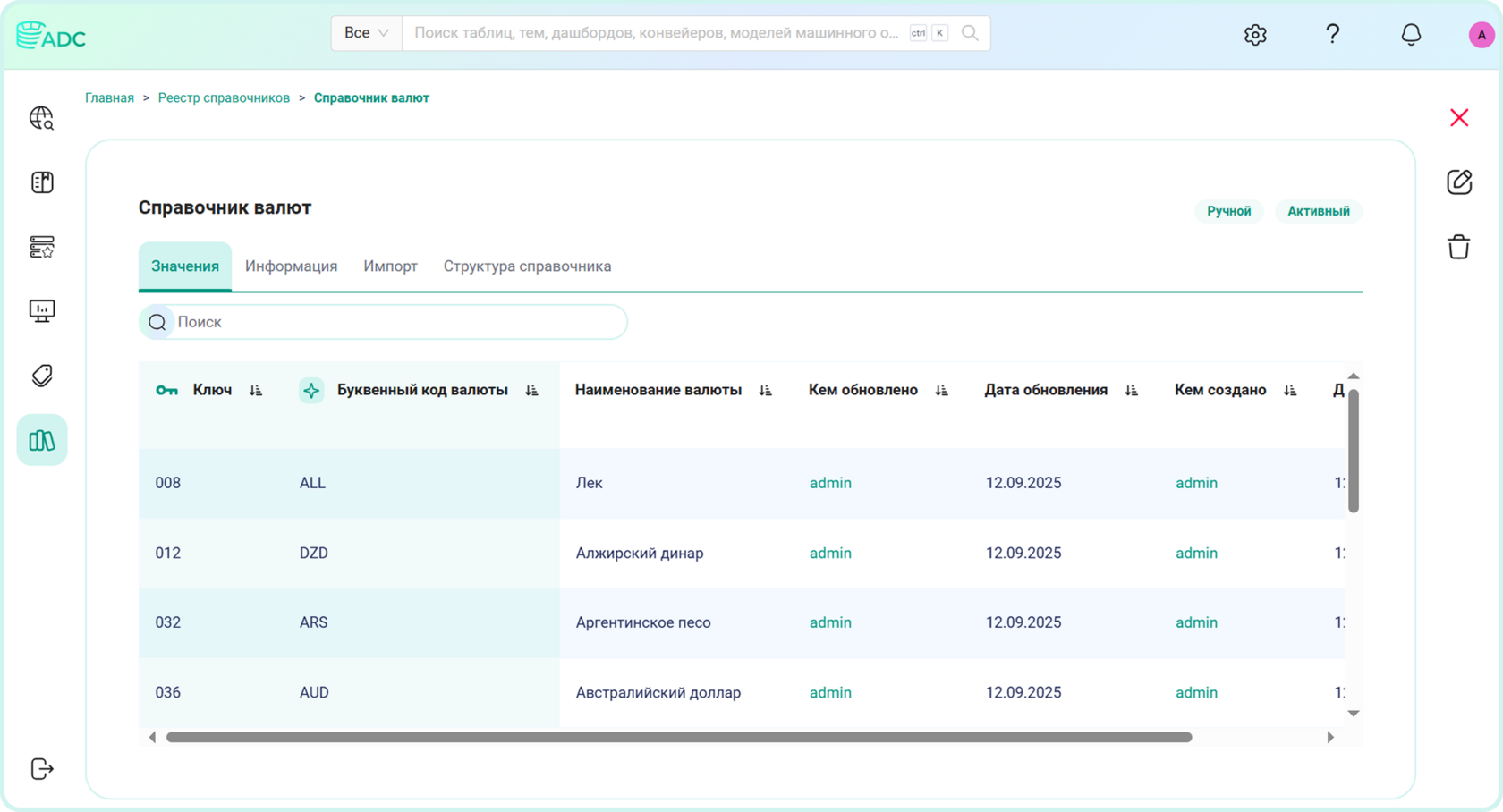 Arenadata Catalog может также интегрироваться с системой для получения записей этого справочника и использования записей в процессах управления данными. На рисунке представлен пример ведения данного справочника внутри системы Arenadata Catalog.