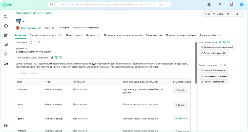 Рассмотрим таблицу orders в СУБД Greenplum, содержащую данные о заказах и клиентах. Метаданные таблицы были отсканированы при подключении сервиса Greenplum и отображены в интерфейсе ADC.