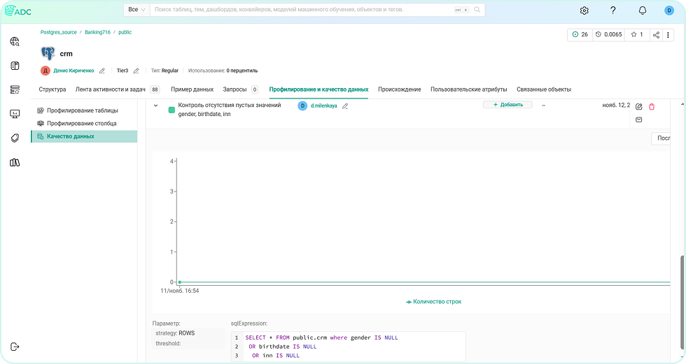 Для таблицы CRM была настроена проверка качества данных с использованием пользовательского SQL-теста. Цель — убедиться, что такие столбцы, как пол клиента, дата рождения и сведения об ИНН, заполнены значениями. Пороговое значение по умолчанию установлено на уровне 0. Для каждого параметра задан объём сохраняемых строк — 5000.