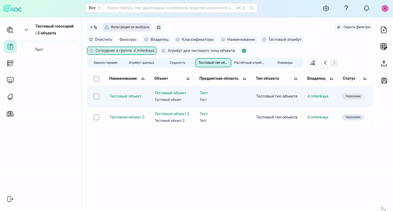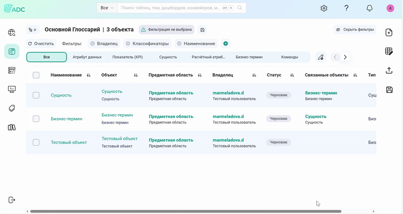 - Теперь фильтры, уникальные для типа, объект которого создан в глоссарии, деактивируются при переключении между типами объектов.