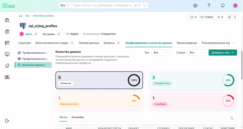 - Обновлены виджеты тестов качества данных. Добавлена возможность фильтрации по статусу теста качества данных в карточках объектов глоссария и таблиц, в разделе «Качество данных» на вкладке «Тесты».
